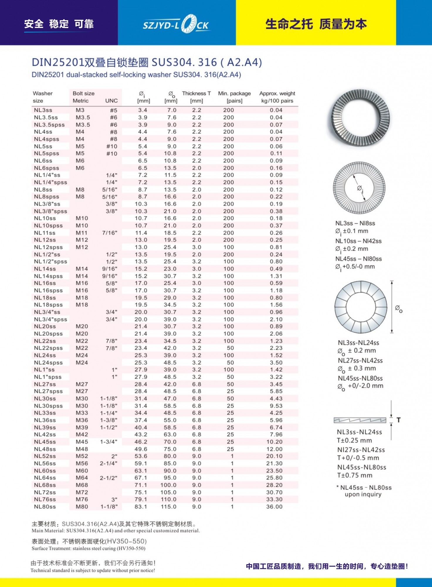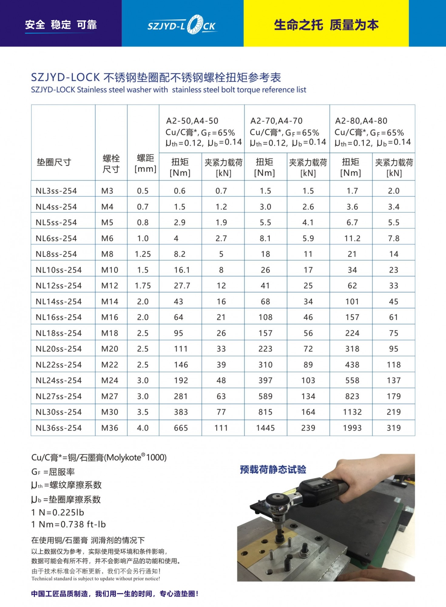 表面全部清洗拋光處理; 雙疊自鎖墊圈的使用:墊圈兩個(gè)大斜齒面成對(duì)粘合,目的是便於安裝和防止錯(cuò)誤用!墊圈的硬度必須高于螺栓的硬度!SZJYD-LOCK墊圈全部經(jīng)過DIN65151橫向振動(dòng)測(cè)試可以達(dá)到200萬(wàn)測(cè)試、其衰減率不低于70%!
