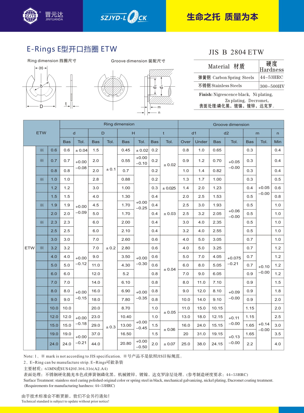 日標JIS2804開口擋圈,使用65MN.C67S彈簧鋼剪切沖壓,經(jīng)拋光后硬化處理,表面采用磷化黑或機工鍍鋅處理!瑞士模走絲精密模具開發(fā),精密度可以做到M0.6規(guī)格!還可根據(jù)用戶要求訂制特殊尺寸型號!史特牢專注精品擋圈設(shè)計制造!