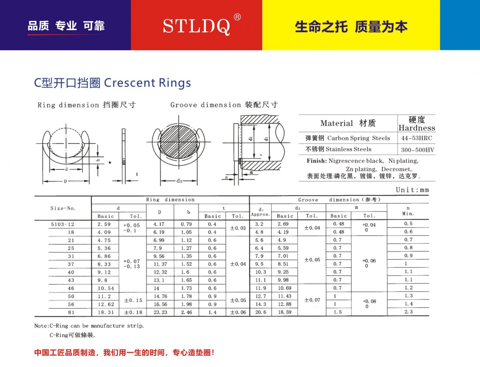 公美制C型開口擋圈,使用65MN,C67S彈簧鋼材質(zhì)及SUS304.SUS316/EN1.4301.EN1.4401不銹鋼材質(zhì),硬化質(zhì)量穩(wěn)定回彈性好!彈簧鋼為磷化黑、機(jī)械鋅表面處理!鹽霧可達(dá)500H以上,保證無氫脆斷裂!進(jìn)口精密模具制造設(shè)備,級進(jìn)模自動化生產(chǎn)效率高成本低!